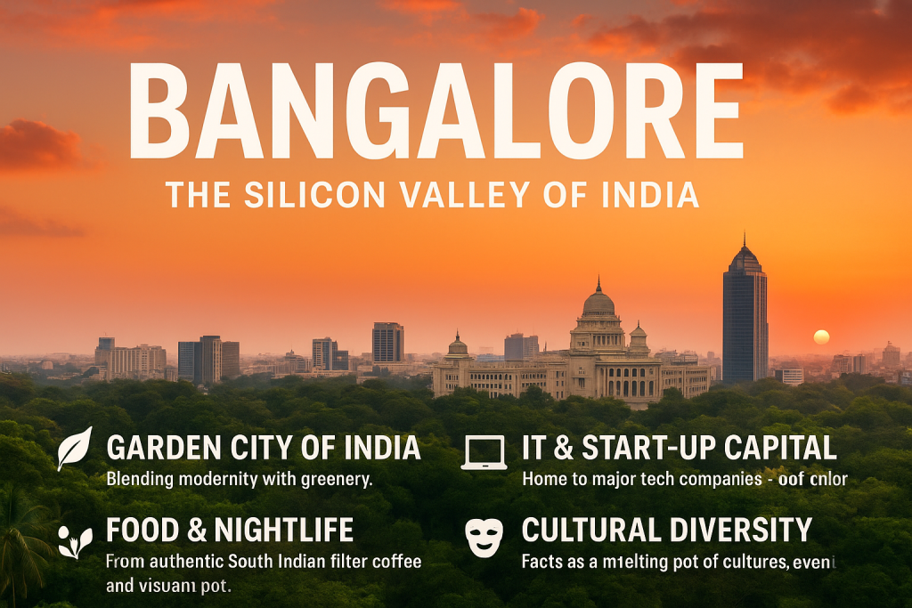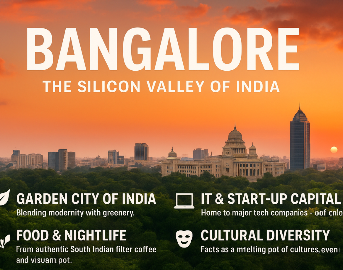 Bangalore, officially known as Bengaluru, is one of India’s most dynamic and vibrant cities. Famous as the Silicon Valley of India, it is the country’s leading hub for IT companies, start-ups, and innovation. But beyond its tech-driven identity, Bangalore is also known for its pleasant climate, rich culture, and cosmopolitan lifestyle.